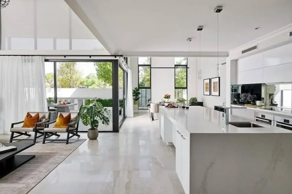 A contemporary home designed around open-plan living, creating a seamless connection between the kitchen, dining, and living areas. The layout enhances natural light and encourages a spacious, connected lifestyle ideal for modern households.